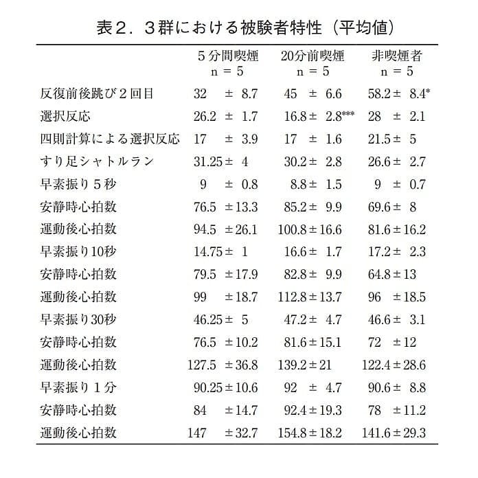 2群(喫煙者群全体・非喫煙者群)間では反復前後跳び課題・四則計算による選択反応課題・すり足・シャトルラン課題・早素振り10秒での安静時心拍数値において、有意差が確認された。