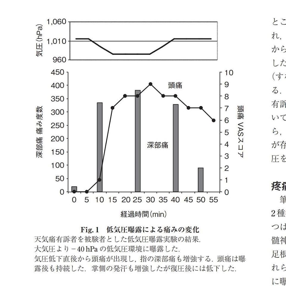 また慢性痛有訴者の一部では気圧や気温の変化に対して自律神経系が過剰に反応することがあり,それが症状悪化のもう 1 つの原因であることを示唆した。」